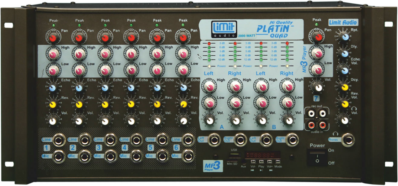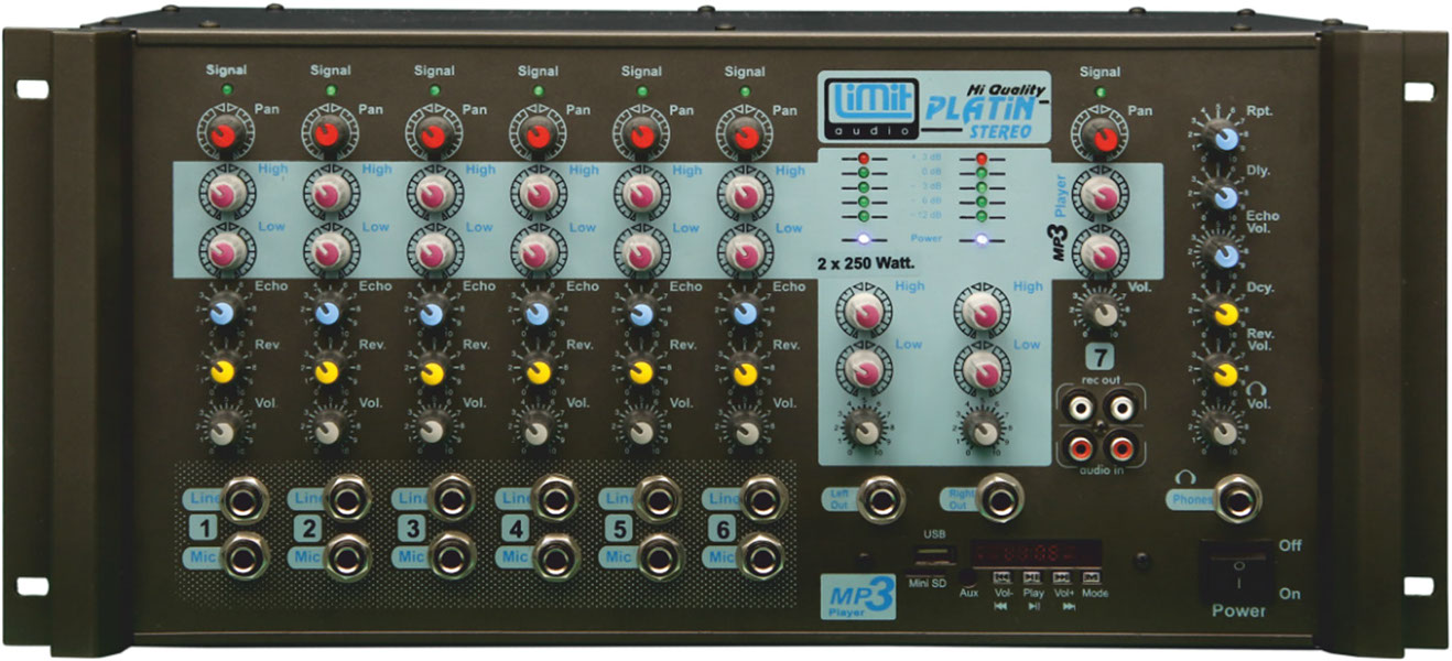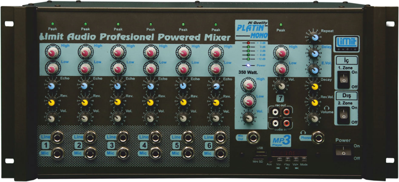 - 7 Kanal girişli (6 kanal ¼ '' TRS line giriş / 6 kanal ¼ '' TRS mikrofon girişi + 1 kanal Mp3)